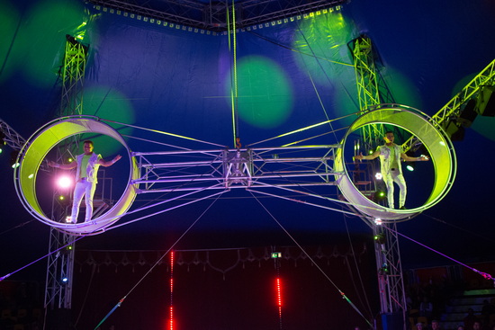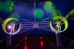 Gleichfalls zwei Mal tritt die Truppe Rippes Ales in Erscheinung. Direkt nach der Pause agieren die beiden Herren auf dem Todesrad. Blindlauf, Seil springen, Aufschwung außen am Rad an einer Hand und risikoreiche hohe Absprünge auf der Außenbahn sind die wesentlichen Elemente der Darbietung.