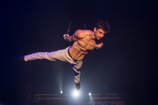 Der erstklassige Strapaten-Act von Brad Dubois lässt die Show furios beginnen. Die umfassende Abfolge vieler Tricks des Genres wird kraftvoll dargeboten und weite Flüge füllen die Kuppel. Gekonnt und in sehr guter Ausführung erfolgen die Aktionen, die in einem Wirbel aus ca. zwanzig Überschlägen ihren Höhepunkt finden.