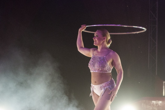 Gleichfalls zwei Mal ist Veera Kaijanen in dieser Show zu erleben. Zunächst sehen wir ihren temperamentvollen Vortrag mit den Hula Hoop Reifen. Gekonnt und abwechslungsreich sind die Routinen und immer wieder werden weitere Reifen in den Ablauf integriert und der Schwierigkeitsgrad der Muster gesteigert.