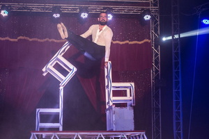 Wenig später sehen wir den jungen Mann gemeinsam mit dem Chef des Hauses, Daniel Prein, mit Handstand-Equilibristik auf Stühlen. Auf einem sehr hohen Piedestal erfolgen die ersten Handstandfiguren der beiden Akteure parallel, dann steigert sich der Schwierigkeitsgrad der Tricks permanent und die Artisten arbeiten alternierend. Ruhig und sehr sicher erfolgen die Handstände auch auf sehr labil angeordneten Stuhlformationen.