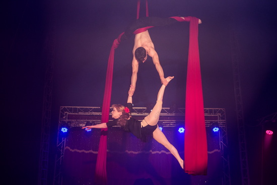In eine temperamentvolle Choreographie haben Victoria Labbe und Arthur Massibot ihre Hand-auf-Hand Akrobatik verpackt. Geschmeidig reihen sich die vielseitigen Tricks aneinander und lassen den Kraftaufwand und die Anstrengung beinahe vergessen. In seinem zweiten Auftritt präsentiert das Duo einen mitreißenden Tango an den Tüchern. Kraftvoll werden die verschiedenen Figuren ausgeführt und eine Reihe Abfaller, bei denen das Paar nur auf seine Griffkraft und ein gutes Timing vertraut, sorgen für den notwendigen Nervenkitzel.