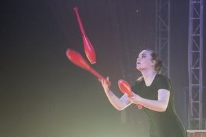 Einen starken optischen Kontrast, sie trägt einen schwarzen hautengen einteiligen neoprenähnlichen Anzug, zum übrigen Programm bietet Aleksandra Kucher bei ihrem Jonglage Act mit langen roten Keulen. Ihr Stil zu jonglieren und ihre Routinen erinnern deutlich an den „Nouveau Cirque“.
