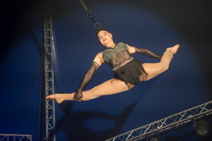 Zwei Luftnummern präsentiert die kubanische Artistin Yeaimy Lorenzo Dominguez. Vor der Pause sehen wir ihre umfangreiche Trickfolge an einem „Kronleuchter“. In der großen und hohen Kuppel kommt der gekonnte Auftritt an dem großrahmigen Requisit besonders zur Geltung.