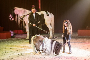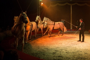 Vor bestens gefüllten Rängen startet die Spielfolge mit der Freiheitsdressur von fünf weißen Araberhengsten. Nach einander kommen die Pferde in die in mystisches blaues Licht getauchte Manege. Sie bewegen sich frei und ungezwungen umher, dann greift Direktor Rudolf Renz ruhig und versiert mit ordnender Hand ein und lässt die verschiedenen Formationen souverän ablaufen. Wenig später präsentiert der Chef des Hauses ein munteres Groß-und-Klein, wobei er von seiner sechsjährigen Tochter Jayda Aline bereits tatkräftig unterstützt wird. Eine weitere Dressur-Darbietung folgt im zweiten Programmteil. Zwei mächtige Steppenkamele bieten im Zusammenspiel mit zwei Alpakas eine variantenreiche Laufarbeit.