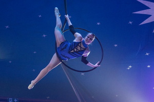 Die finnische Artistin Charlotta Ingraeus ist mit zwei Luft-Darbietungen zu erleben. Zunächst präsentiert sie ihr Können am Luftring. In einem harmonischen Ablauf werden die verschiedenen Aktionen gekonnt ausgeführt.