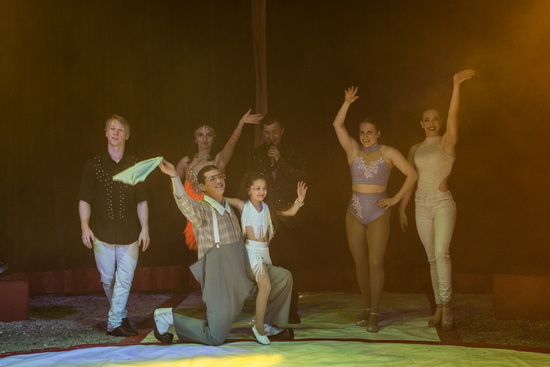 Als Spielstätte ist ein weißes Vier-Masten-Chapiteau, dessen violette Applikationen einen lebhaften Kontrast bilden, aufgebaut. Einige Sturmstangen geben dem Zeltbau seine Form. Ein blau und weiß gestreifter Stall ergänzt das Arrangement und bietet den Tieren großzügigen Raum.