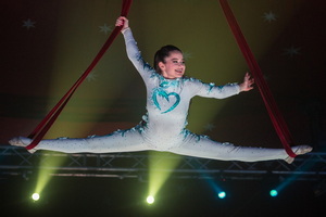 Selena Cannone-Chaves, vierzehnjährige Tochter des Hauses hat sich eine harmonische Strapaten-Darbietung erarbeitet. Mit Können, Kraft, einem strahlenden Lächeln und jugendlichem Charme präsentiert die junge Artistin gekonnt ihre veritable Trickfolge.