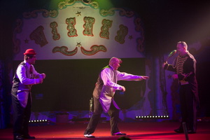 Die Auguste Leonel Chaves und Leonardo de Vos erobern, vom Haupteingang kommend, als Abenteurer auf der Suche nach einem gefährlichen Ungeheuer die Bühne. Sie stöbern das Versteck auf und besiegen die Kreatur. Nun kommen die Artisten nacheinander auf die Bühne und staffieren die beiden Helden zu Clowns aus.