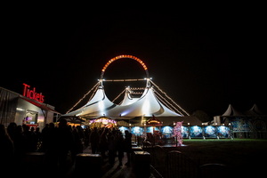 Schon von Weitem strahlt der große Circus im weihnachtlichen Glanz zahlloser Lichter und zieht die Besucher magisch an. Die weißen Zeltanlagen mit dem exquisiten schwarzen Dekor werden von der roten Leuchtschrift des Namenszuges gekrönt. Die Frontwagen tragen neben dem großflächigen Logo des Unternehmens großformatige Motive aus vergangenen Spielzeiten. Lichterbögen am Zaun, funkelnde beleuchtete Dekorelemente und zahlreiche Lichterketten verbreiten ein romantisches Flair.