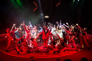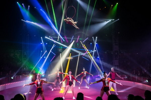 Der hohe Artisteneingang aus dunkelrotem Samt wird von zahlreichen Beleuchtungselemente eingerahmt und bietet auf seiner Empore dem ausgezeichnet aufspielenden und die Artisten wirkungsvoll unterstützenden sechsköpfigen Orchester Platz. Mit einem großartigen Lichtdesign wird die Show hervorragend dargestellt.