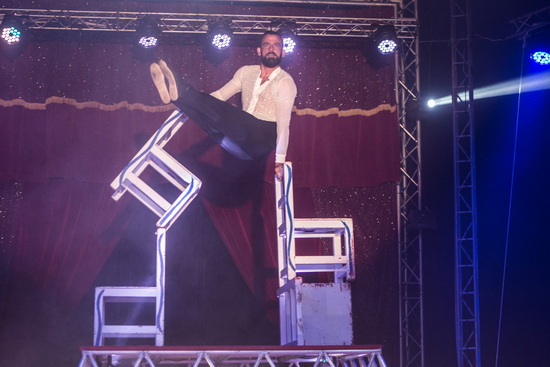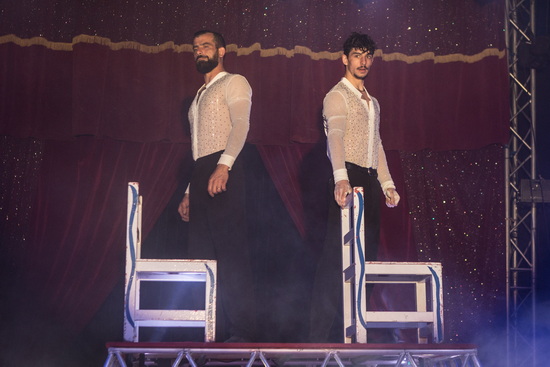Wenig später sehen wir den jungen Mann gemeinsam mit dem Chef des Hauses, Daniel Prein, mit Handstand-Equilibristik auf Stühlen. Auf einem sehr hohen Piedestal erfolgen die ersten Handstandfiguren der beiden Akteure parallel, dann steigert sich der Schwierigkeitsgrad der Tricks permanent und die Artisten arbeiten alternierend. Ruhig und sehr sicher erfolgen die Handstände auch auf sehr labil angeordneten Stuhlformationen.