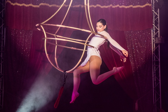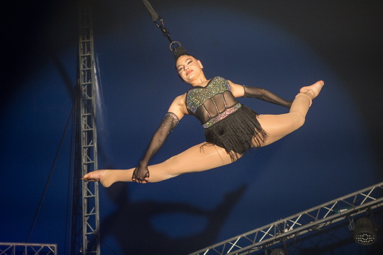 Zwei Luftnummern präsentiert die kubanische Artistin Yeaimy Lorenzo Dominguez. Vor der Pause sehen wir ihre umfangreiche Trickfolge an einem „Kronleuchter“. In der großen und hohen Kuppel kommt der gekonnte Auftritt an dem großrahmigen Requisit besonders zur Geltung.