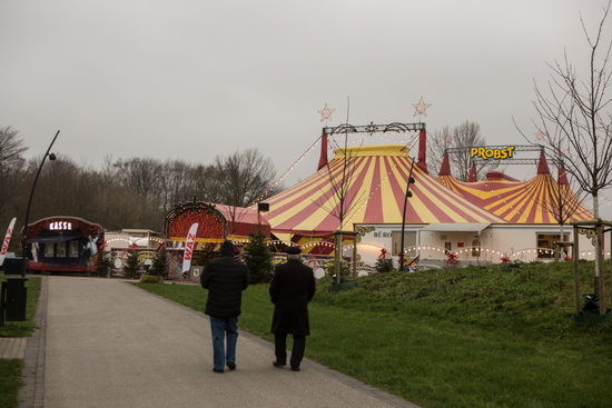 Wie seit vielen Jahren war der große Circus im Revierpark Nienhausen aufgebaut und bot den vertrauten Anblick. Die rot-gelben Zeltanlagen an diesem trüben Wintertag im Schein unzähliger Lichterketten. Ein Zweimaster bildet das Vorzelt und wird vom großen hohen Viermasten Chapiteau überragt. Stallungen, Freigehege und die zahlreichen Circuswagen nehmen den übrigen Raum ein. Opulenter Weihnachtsschmuck, stets ein besonderes Highlight dieses Weihnachtscircus, ziert Zäune, Kasse, Fahrzeuge und Zelte und sorgt mitsamt der zahlreichen Weihnachtsbäume für ein festliches Flair.