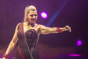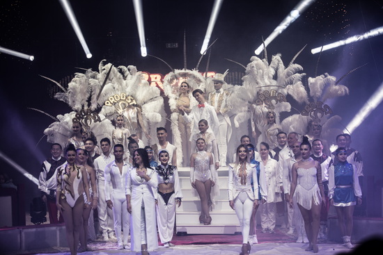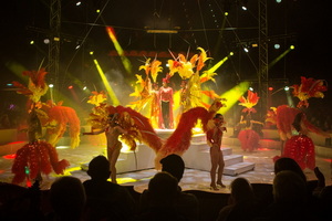 Im Opening wird das Motto der Show eindrucksvoll umgesetzt. Sowohl das Lichtdesign als auch die Kostüme erstrahlen in rot und gelb. Aufwändige Federboas sowie eingearbeitete LED Lichtschnüren an den Kostümen und im üppigen Kopfputz, der auch den Namenszug „Probst“ zeigt, der Tänzerinnen verleihen dem Ballett eine besondere Aura. Die elegante Choreographie füllt die Manege rings um die vierteilige Showtreppe, auf deren Empore Sängerin „Lily“, sie durften wir bereits in den Vorjahren hier erleben, das Geschehen mit ihrer starken Stimme begleitet.