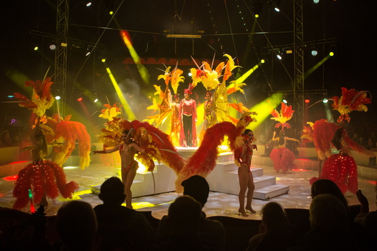 Ein großes Schalensitzgradin und elegante dreireihige Logen stehen im Spielzelt für die zahlreichen Besucher bereit. Der große Artisteneingang aus dunkelrotem Samt bietet auf seiner Empore dem ausgezeichnet aufspielenden Orchester und der Leitung von Juri Rebenok den angemessenen Raum.