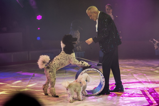 Wenig später leitet der erfahrene und vielseitige Tierlehrer gemeinsam mit seiner Frau Marietta sechs Pudel zu ihrem munteren Treiben an. Vielseitige Sprünge, Rollenlauf und Hochsitzer werden mit Eifer ausgeführt.