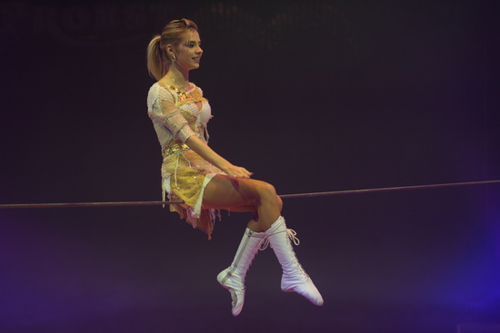 Die Tochter der beiden, Claudia Rapolli Navratilova, tanzt auf dem Seil. Mit frischem Schwung und jugendlichem Charme präsentiert die Nachwuchsartistin ihr Können, das in einem Spagat, einem Handstandüberschlag und dem Sprung durch einen mit Dolchen besetzten Feuerreifen gipfelt.