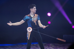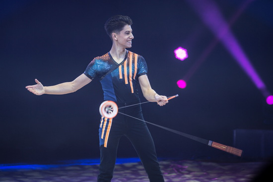 Dieser ist in seinem Soloauftritt als sehr versierter Diabolo-Jongleur zu erleben. Fehlerfrei und gekonnt werden die vielseitigen Routinen vorgetragen. Bis zu drei Diabolos werden zur gleichen Zeit sicher in der Luft gehalten.