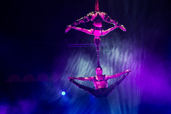 Einen faszinierenden und nur selten zu sehen Act bietet ein Paar, dessen Namen leider nicht kommuniziert wurde, mit doppeltem Zopfhang. Beide Partner treten als Porteure in Erscheinung und schließlich schwebt der männliche Partner mit einem Motorrad an seinem Zopf hoch in die Kuppel.