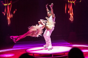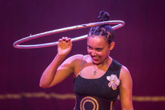 Im zweiten Teil der Show agiert der weibliche Part des Duo in ähnlichem Stil mit Hula Hoop Ringen. Auch dieser Act zeichnet sich neben vielseitigen Tricks durch seinen verspielten, fröhlichen Stil aus.