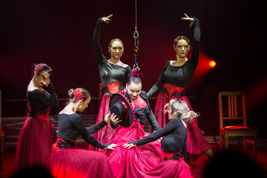 Ein furioses spanisches Bild des ausgezeichneten Balletts mündet in die Zopfhang-Darbietung von Michaela Wohlfahrt. Recht lange schwebt die zierliche Artistin an ihren Haaren durch den Raum und bringt dabei ihre Gliedmaßen in immer wieder neue Positionen.