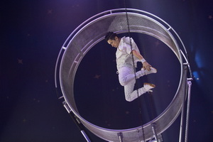 Wenig später sehen wir den Porteur des Duo mit einem anderen Partner auf dem US-Todesrad. Vielseitige und weite Sprünge in den Kesseln, Seil laufen außen auf dem Rad, Blindlauf und riskante hohe Absprünge auf der Außenbahn kennzeichnen den Auftritt.