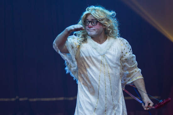 Im Spielzelt stehen ein großes, steil aufragendes Schalensitzgradin sowie Logen mit bequemen Polsterstühlen für die zahlreichen Besucher bereit und ein großer Artisteneingang aus rotem Samt schließt den hinteren Zeltteil ab.