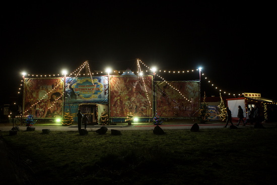 Die Frontseite des Geländes wird von einer hohen und breiten Fassade, deren Planen mit großformatigen Circusmotiven bemalt sind, abgeschlossen. Der Container, der die Circuskassen beheimatet ergänzt das Arrangement und zahlreiche Lichterketten und Weihnachtsbäume schaffen ein stimmungsvolles Ambiente.