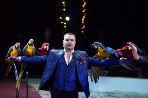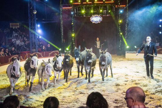 Mit der ersten von drei Tier-Darbietungen sehen wir Kevin Probst zu Beginn der Show. Acht Esel trippeln ihre Figuren unter der gekonnten Peitschenführung des versierten Tierlehrers in den Manegensand. Pirouetten, Volten, Gegenläufe und Abliegen werden souverän und flott gearbeitet. Ein Mini-Pony beschließt mit einem Steiger den Auftritt. Vor der Pause präsentiert Kevin Probst seine Papageien Revue. Sechs Aras, ein Kakadu und ein halbes Dutzend Sonnensittiche sind in den Ablauf involviert. Sie fliegen zum Vorführer, betätigen sich akrobatisch auf ihren Sitzstangen, durchfliegen von Kindern hochgehaltene Reifen und überbringen eine Rose. Besonderen Anklang im vollbesetzten Rund finden die langen und lautlosen Flüge der großen Vögel über den Rängen. Im zweiten Teil sind fünf Hunde eifrig dabei ihr Sprungvermögen zu präsentieren.