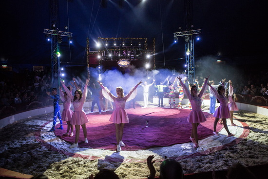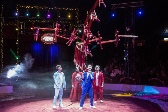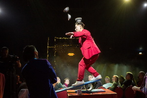 Raoul Schoregge hat die Show inszeniert und als Clown „Correggio“ erleben wir ihn in der Manege. Im Opening versucht der Clown im roten Ring zu picknicken, doch der Lichtkreis in den er sich setzt verharrt nicht. Schließlich „fängt“ er das Licht in seinem Korb und lässt die Scheinwerfer aufflammen. Nun ist es an der „Group de Mirage“, sechs junge ukrainische Tänzerinnen und Artistinnen, mit einem furiosen Charivari das Publikum mitzureißen. Abläufe aus vielen verschiedenen Genres fließen in die temperamentvolle Choreografie mit ein.