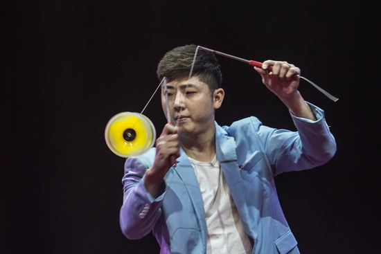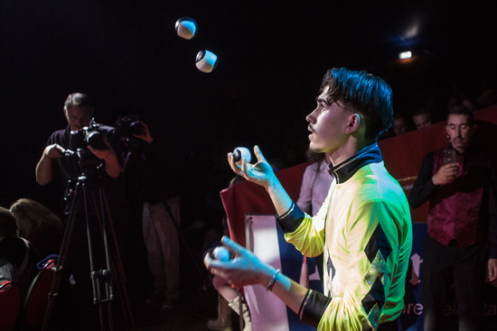 Eine veritable Diabolojonglage sieht einen weiteren Artisten in Aktion. Rasant und fehlerfrei erfolgen die Routinen und schließlich sind drei Diabolos zur gleichen Zeit in der Luft.