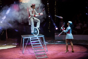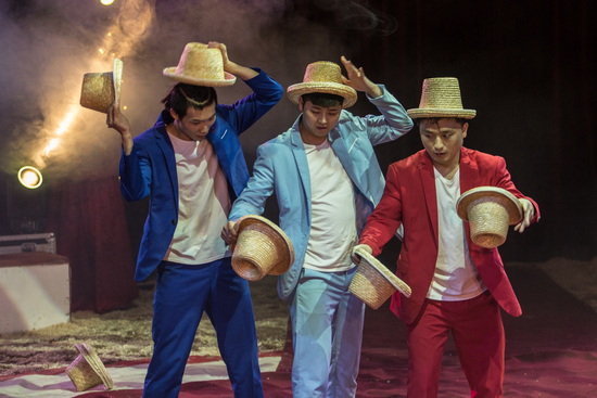 Clown „Correggio“ dirigiert in seinen Reprisen ausführlich den Applaus des Publikums und fängt einen imaginären Ball in einer Papiertüte. Mit Partnerin Sun Qing Qing tritt er in einen Wettstreit im Wasser spucken.
