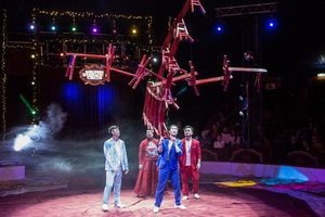 Die erste Luft-Darbietung der Show bietet Emi Velkova an den Strapatentüchern. Die sympathische Artistin vereint Eleganz und kraftvolle Akrobatik zu einer perfekten Kür. Mit großer Ausstrahlung erfolgen die zahlreichen Figuren sehr hoch in der Kuppel und eine Reihe riskanter Abfaller bieten Nervenkitzel pur.