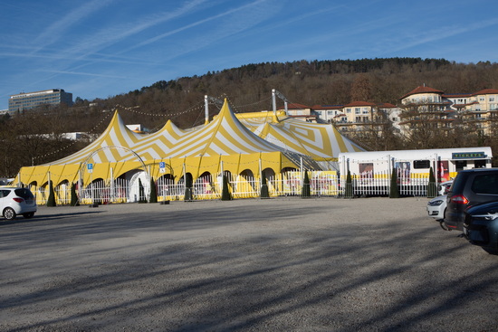Das gepflegte technische Equipment wurde wiederum vom Circus Universal Renz angemietet. Die großen gelb-weißen Zeltanlagen leuchten festlich im Schein zahlloser Lichterketten und der fein restaurierte Tonnendach-Kassenwagen von Rudi Bauer fügt sich perfekt ins Gesamtbild ein.