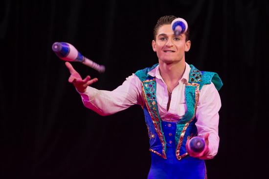 Christiano Dias ist mit seinen gelungenen Jonglagen als erster zu erleben. Keulen, Tennisbälle und bis zu sieben Ringe sind seine Requisiten, die er sicher und variantenreich zu manipulieren versteht.