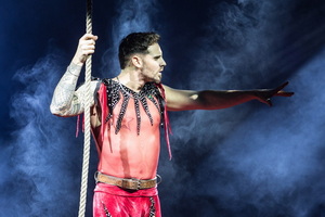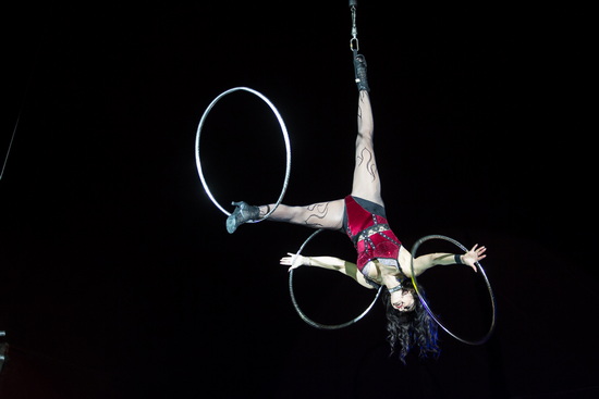 Direkt im Anschluss sehen wir eine völlig andere Jonglage-Disziplin – Ernita Ronzalli präsentiert ihr Können mit Hula Hoop Ringen. Temperamentvoll werden die verschiedenen Routinen vorgetragen und zudem beherrscht die versierte Artistin außergewöhnliche Tricks. Mehrfach schwebt sie an einer Strapate hoch in die Kuppel und lässt dabei weiterhin die Reifen um Körper und Gliedmaße rotieren.