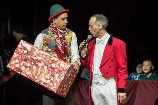 Im Spielzelt stehen ein großes Schalensitzgradin sowie dreireihige Logen mit bequemen Polsterstühlen für die Besucher bereit. Der raumhohe Artisteneingang nimmt den hinteren Zeltbereich ein und wird von zwei großen Weihnachtsbäumen flankiert.