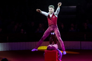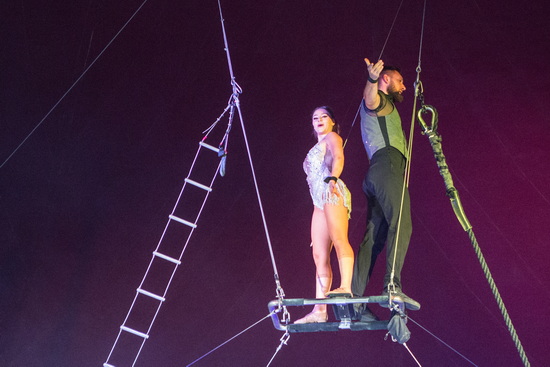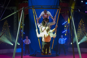 Direkt vor der Pause und zu Beginn des zweiten Teils waren die beiden Darbietungen der „Truppe Steam“ platziert. Zunächst sind vielseitigen Aktionen der sechs ukrainischen Artisten an der Trampolin Wall zu sehen. Wenig später folgen die Sprünge von der „Russischen Schaukel“ in eine Stoffbahn, die im Hintergrund der Manege aus der Kuppel bis zur Erde gespannt ist.