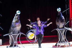 Zunächst präsentieren Perry und Dani Jahn ihre beiden mächtigen Seelöwen in humorvoller Weise. Die Robben balancieren Bälle und stellen ihre Gesangskünste unter Beweis. In Interaktion mit zwei Kindern aus dem Publikum fangen sie Ringe auf und können sogar gestreichelt werden.
