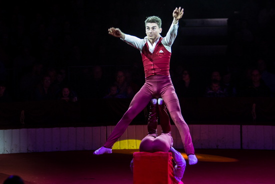 Denis Ilchenko stellt seine Kräfte in vielseitiger Weise und mit einem Augenzwinkern unter Beweis. Zum aufwärmen wird mit drei Pkw-Reifen jongliert und ein Metallrohr zu einer Schleife gebogen. Nun zieht der starke Mann einen schweren SUV an einer Kette nur mit seinen Zähnen quer durch die Manege. Ein Holzstamm als Joch auf seinen Schultern wird mit vier Personen besetzt und als Art Karussell in Bewegung gesetzt. Den Höhepunkt der Demonstrationen seiner Kraft bildet das überrollen seines Oberkörpers durch das SUV.