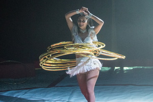 Das Spiel mit den Hula Hoop Reifen beherrscht Jaqueline Traber perfekt. Gekonnt lässt sie die Ringe in immer wieder neuen Figuren um ihren Körper kreisen, steigert dabei beständig den Schwierigkeitsgrad. Schließlich sind es zwanzig Reifen, die die sympathische Artistin sicher zur gleichen Zeit manipuliert.