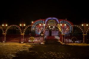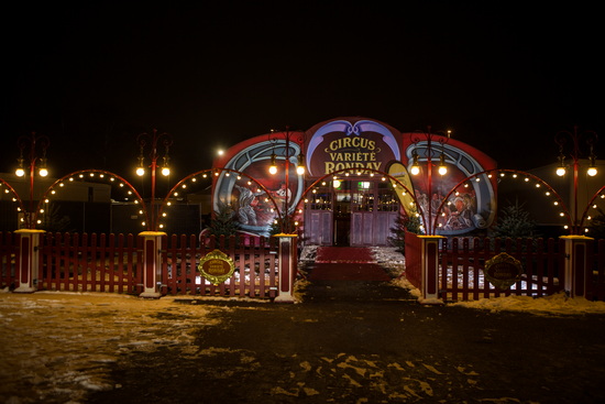 Eine fein geschweifte und kunstvoll bemalte Fassade, mit zwei überlebensgroßen Szenen aus einer Show, bildet zusammen mit einem nostalgischen rot-weißen Holzzaun die Front. Lichterbögen, Kandelaber und erhabene, aufwändig gestaltete Plaketten mit dem Logo des Circus schmücken den Zaun und die Lichter sind die einzigen hellen und strahlenden Punkte im Schneetreiben dieses nasskalten Wintertages. Aufwändig verglaste, alle Scheiben sind mit Facettenschliff versehen, Schiebetüren führen in einen ebensolchen Windfang und weiter geht es in ein gemütliches Foyer. Holzboden, roter Stoff an Decke und Wänden, Sitzgruppen und nostalgisch gestaltete Verkaufsstände strukturieren den Raum.