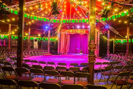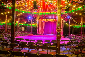 Das sehr gepflegte Spielzelt – oder vielleicht sollte man besser von einem Theatersaal sprechen – bietet eine eigene, irgendwo zwischen edel und heimelig, Atmosphäre. Zwölf schlanke, mit kleinen Spiegeln und Holzleisten verzierte Holzsäulen tragen die Kuppel und rahmen die leicht erhöhte, runde und mit rotem Teppich belegte Bühne ein. Roter Stoff und große Spiegel gliedern die Seitenwände und das umlaufende, farbig verglaste Oberlichtband schafft eine angenehme Grundbeleuchtung. Der Holzboden weißt drei Ebenen auf und rund vierhundert gepolsterte Klappstühle stehen für die Besucher bereit.