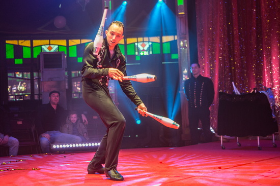 Tempo geladen manipuliert Jongleur Rafael Gill seine Requisiten. Mit Keulen werden die ersten Touren abwechslungsreich gestaltet und bis zu fünf Stück souverän in der Luft gehalten. Im Folgenden sind Fußbälle und kurz darauf kleine Bälle, die der Jongleur in Köchern an seinem Gürtel fängt Mittel der Wahl. Abschließend werden spektakulär Sombreros jongliert.