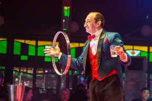 Turbulent beginnt der zweite Programmteil mit der ausgezeichneten Tellerjonglage von Lajos Nereus. Mit großer Präsenz, Können und einem ausgezeichneten Timing agiert der versierte Artist in hohem Tempo. Er baut eine Reihe „Nebenschauplätze“ und erhöht somit die Spannung des temporeichen Ablaufs. Zudem fördert das gekonnte rekommandieren von Rob Ronday und die spitzen Ausrufe der Assistentin den Verkauf. Ein Glas mit Wasser wird in einem Metallreifen manipuliert, was natürlich zunächst misslingt. Vier Eier werden durch wegschlagen ihrer Auflage in Gläser platziert, die auf einem Tablett auf einer hohen Stange über der Stirn den Jongleurs stehen. Dazu kommen zwischenzeitlich Besen und Kehrblech zum Einsatz um die Reste eines zerbrochenen Tellers zu beseitigen. Doch allen Widrigkeiten zum Trotz rotieren die anvisierten zehn Teller schließlich auf ihren Stangen und die Glas-Manipulation gelingt.